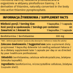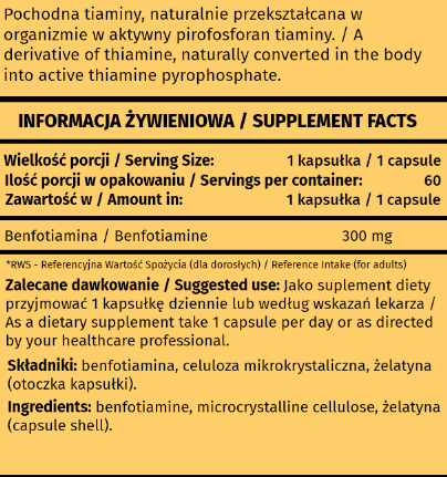 Benfotiamina to rozpuszczalna w tłuszczach pochodna tiaminy. Dzięki swojej unikalnej strukturze wykazuje wysoką stabilność i biodostępność. Produkt pozwala na precyzyjne uzupełnienie diety w benfotiaminę, która po spożyciu ulega w organizmie przekształceniu w aktywną tiaminę.