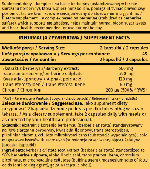 ekstrakt z korzenia berberysu (berberis aristata) standaryzowany na 98% siarczanu berberyny, kwas alfa-liponowy, pterostylben, pikolinian chromu, celuloza mikrokrystaliczna (substancja wypełniająca) , sole magnezowe kwasów tłuszczowych (substancja przeciwzbrylająca), żelatyna (otoczka kapsułki).