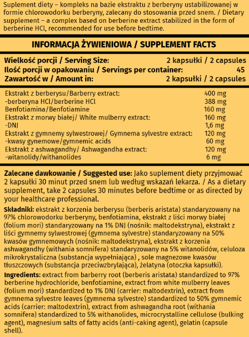 ekstrakt z korzenia berberysu (berberis aristata) standaryzowany na 97% chlorowodorku berberyny, benfotiamina, ekstrakt z liści morwy białej (folium mori) standaryzowany na 1% DNJ (nośnik: maltodekstryna), ekstrakt z liści gymnemy sylwestrowej (gymnema sylvestre) standaryzowany na 50% kwasów gymnemowych (nośnik: maltodekstryna), ekstrakt z korzenia ashwagandhy (withania somnifera) standaryzowany na 5% witanolidów, celuloza mikrokrystaliczna (substancja wypełniająca) , sole magnezowe kwasów tłuszczowych (substancja przeciwzbrylająca), żelatyna (otoczka kapsułki).