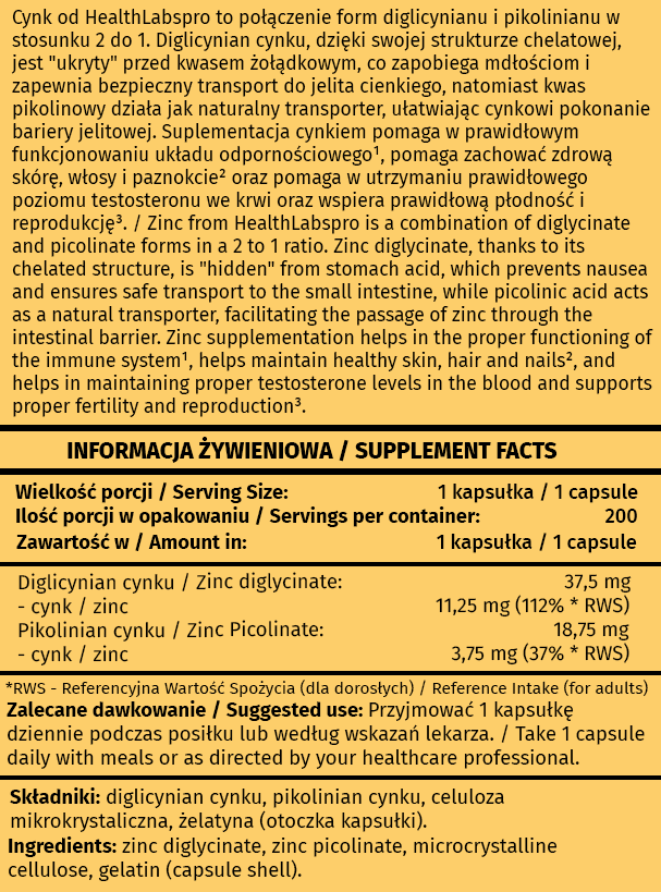 diglicynian cynku, pikolinian cynku, celuloza mikrokrystaliczna, żelatyna (otoczka kapsułki).