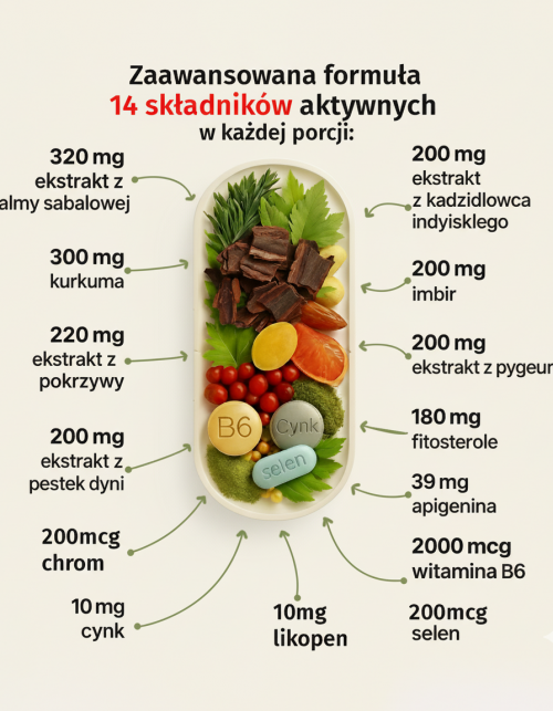 Ekstrakt z owoców palmy sabałowej, korzeń kurkumy (Curcuma longa), ekstrakt z liści pokrzywy (Urica fissa), ekstrakt z nasion dyni (Semen Moschatae), ekstrakt z żywicy kaziodłowca indyjskiego, klącze imbiru (Zingiber officinale), ekstrakt z owocu śliwy afrykańskiej, fitosterole z kory sosny czarnej (pinus nigra), ekstrakt z owocu pomidora (Solanum lycopersieum) standaryzowany na likopen, ekstrakt z skórki grejpfruta (Citrus Paradisi M.) standaryzowany na apigeninę, pikolinian cynku, p-5-p fosforan pirydoksalu (witamina b6), l-selenometionina, pikolinian chromu, cholekalcyferol, celuloza mikrokrystaliczna (substancja wypełniająca) , sole magnezowe kwasów tłuszczowych (substancja przeciwzbrylająca), hydroksypropylometyloceluloza (otoczka kapsułki).