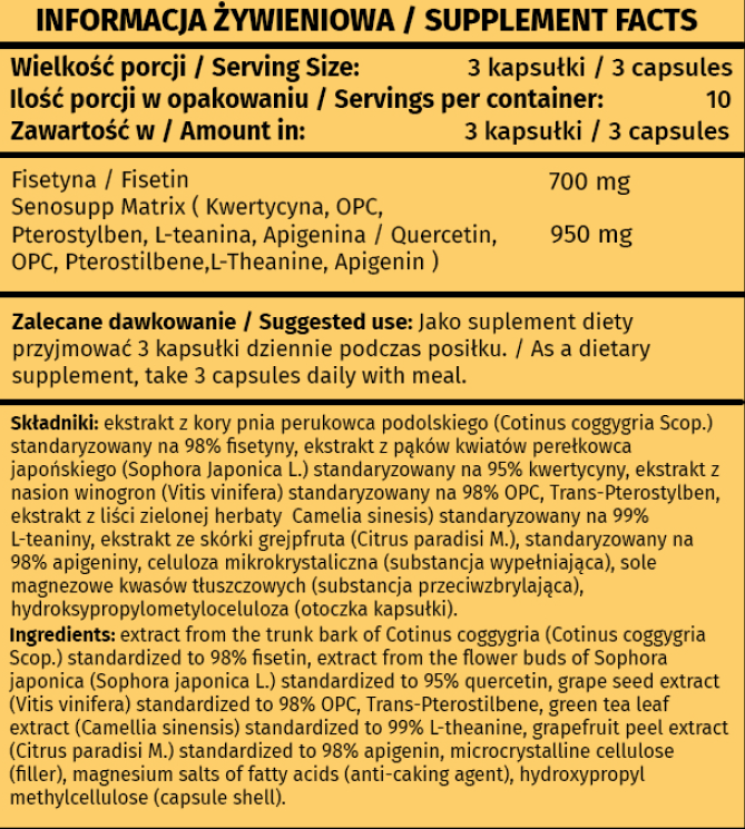 ekstrakt z kory pnia perukowca podolskiego (Cotinus coggygria Scop.) standaryzowany na 98% fisetyny, ekstrakt z pąków kwiatów perełkowca japońskiego (Sophora Japonica L.) standaryzowany na 95% kwercetyny, ekstrakt z nasion winogron (Vitis vinifera) standaryzowany na 98% OPC, Trans-Pterostylben, ekstrakt z liści zielonej herbaty Camelia sinesis) standaryzowany na 99% L-teaniny, ekstrakt ze skórki grejpfruta (Citrus paradisi M.), standaryzowany na 98% apigeniny, celuloza mikrokrystaliczna (substancja wypełniająca), sole magnezowe kwasów tłuszczowych (substancja przeciwzbrylająca), hydroksypropylometyloceluloza (otoczka kapsułki).
