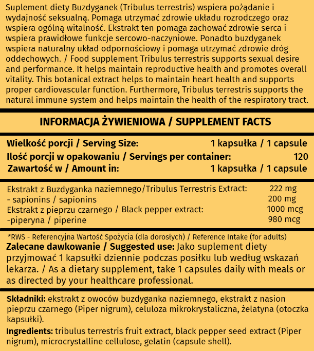 Suplement diety Tribulus Terrestris zawiera ekstrakt z owoców buzdyganka naziemnego, który promuje pożądanie i sprawność seksualną (ID 2831) oraz wspiera zdrowie skóry (ID 2831, 3622) i serca (ID 4178, 4184). Aby zwiększyć biodostępność produktu, ekstrakt został wzbogacony o piperynę (ID 2109, 2111).