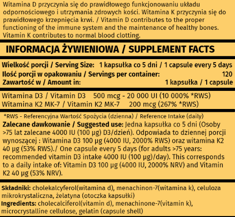 Witamina D3 20K UI + K2 MK7 200 mcg w kapsułkach