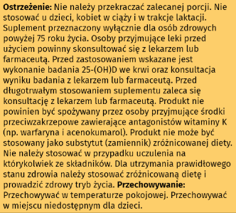 Nie należy przekraczać zalecanej porcji. Nie stosować u dzieci, kobiet w ciąży i w trakcje laktacji. Suplement przeznaczony wyłącznie dla osób zdrowych powyżej 75 roku życia. Osoby przyjmujące leki przed użyciem powinny skonsultować się z lekarzem lub farmaceutą. Przed zastosowaniem wskazane jest wykonanie badania 25-(OH)D we krwi oraz konsultacja wyniku badania z lekarzem lub farmaceutą. Przed długotrwałym stosowaniem suplementu zaleca się konsultację z lekarzem lub farmaceutą. Produkt nie powinien być spożywany przez osoby przyjmujące środki przeciwzakrzepowe zawierające antagonistów witaminy K (np. warfaryna i acenokumarol). Produkt nie może być stosowany jako substytut (zamiennik) zróżnicowanej diety. Nie należy stosować w przypadku uczulenia na którykolwiek ze składników. Dla utrzymania prawidłowego stanu zdrowia należy stosować zróżnicowaną dietę i prowadzić zdrowy tryb życia.