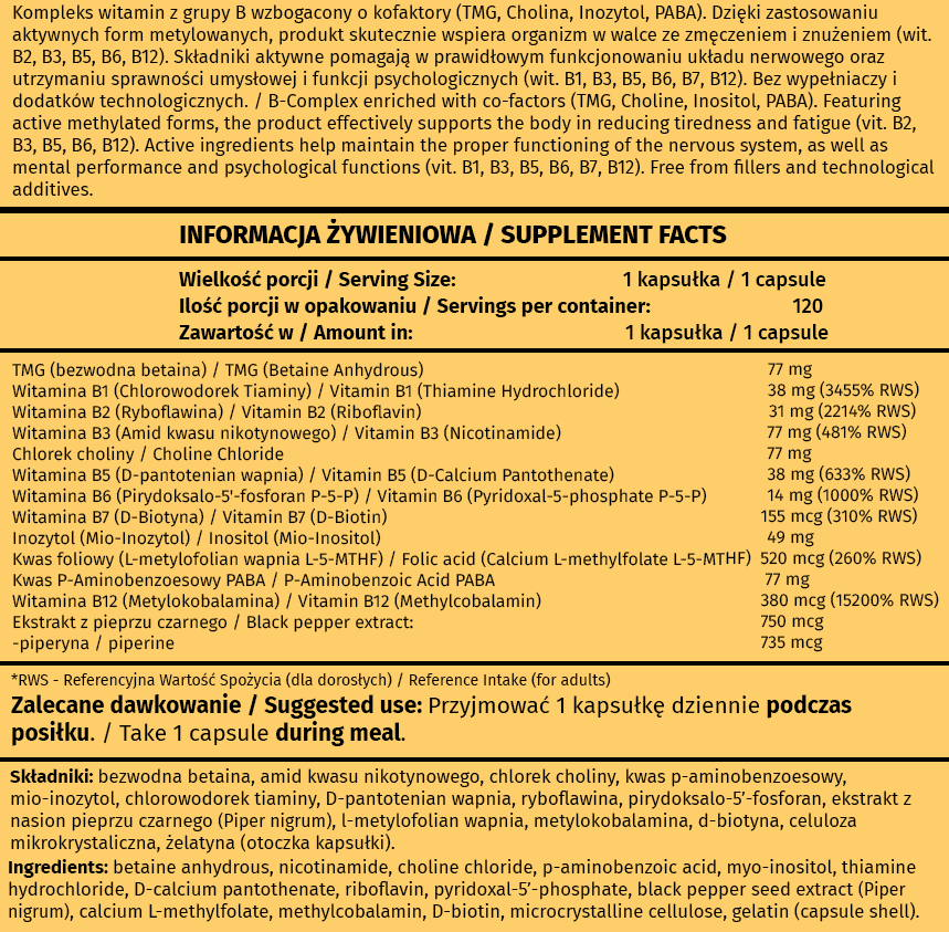 bezwodna betaina, amid kwasu nikotynowego, chlorek choliny, kwas p-aminobenzoesowy, mio-inozytol, chlorowodorek tiaminy, D-pantotenian wapnia, ryboflawina, pirydoksalo-5’-fosforan, ekstrakt z nasion pieprzu czarnego (Piper nigrum), l-metylofolian wapnia, metylokobalamina, d-biotyna, celuloza mikrokrystaliczna, żelatyna (otoczka kapsułki).